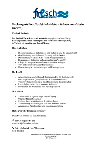 Fachangestellte/r für Bäderbetriebe (m/w/d) in Vollzeit - ganzjährige Beschäftigung